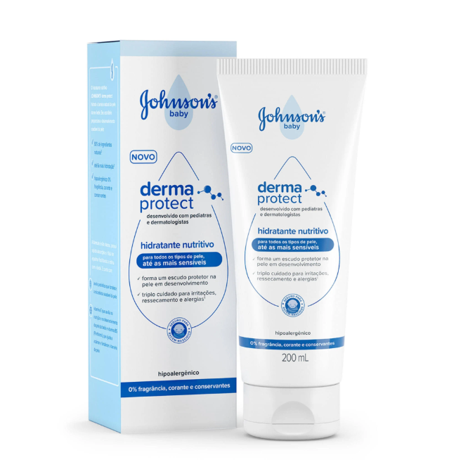 O Hidratante Nutritivo Johnson’s Baby Derma Protect forma um escudo protetor na pele em desenvolvimento com triplo cuidado para irritações, ressecamento e alergias. Sua composição é ideal para todos os tipos de pele, até as mais sensíveis e pode ser usada desde o primeiro dia de vida do bebê. E sua textura não oleosa, possui rápida absorção e é fácil de espalhar, facilitando a rotina com o bebê.