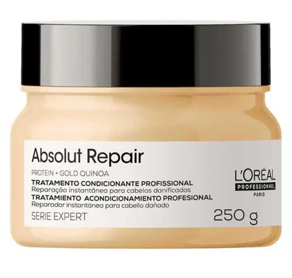 A Máscara de Reparação L’Oréal Professionnel Serie Expert Absolut Repair Gold Quinoa de 250 gramas, promove reparação e reconstrução instantânea dos fios, brilho intenso, maciez e uma hidratação profunda com suavidade dos fios. Máscara para cabelos finos, danificados e quebradiços. Seus principais ingredientes, são a Quinoa Dourada e a Proteína Hidrolisada de Trigo que mantém as cutículas seladas para um cabelo com 77% menos danos, 7x mais brilho, toque leve e macio.