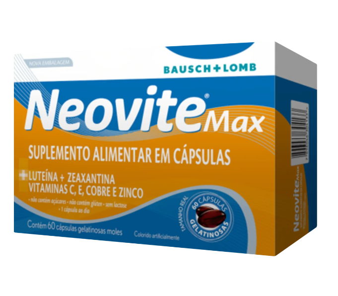 Suplemento para saúde da Visão Neovite Max é um polivitamínico formulado para ajudar na saúde ocular. Sua composição contém Luteína e Zeaxantina, antioxidantes naturais que protegem os olhos contra os danos da luz azul e do envelhecimento. Além disso, é enriquecido com Vitaminas C e E, Cobre e Zinco, nutrientes essenciais para a manutenção da visão.