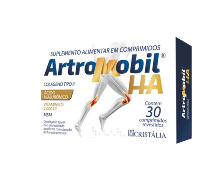 O Artromobil HA é um suplemento alimentar em comprimidos formulado com colágeno Tipo II, Ácido Hialurônico, vitamina d 2.000UI e MSM.